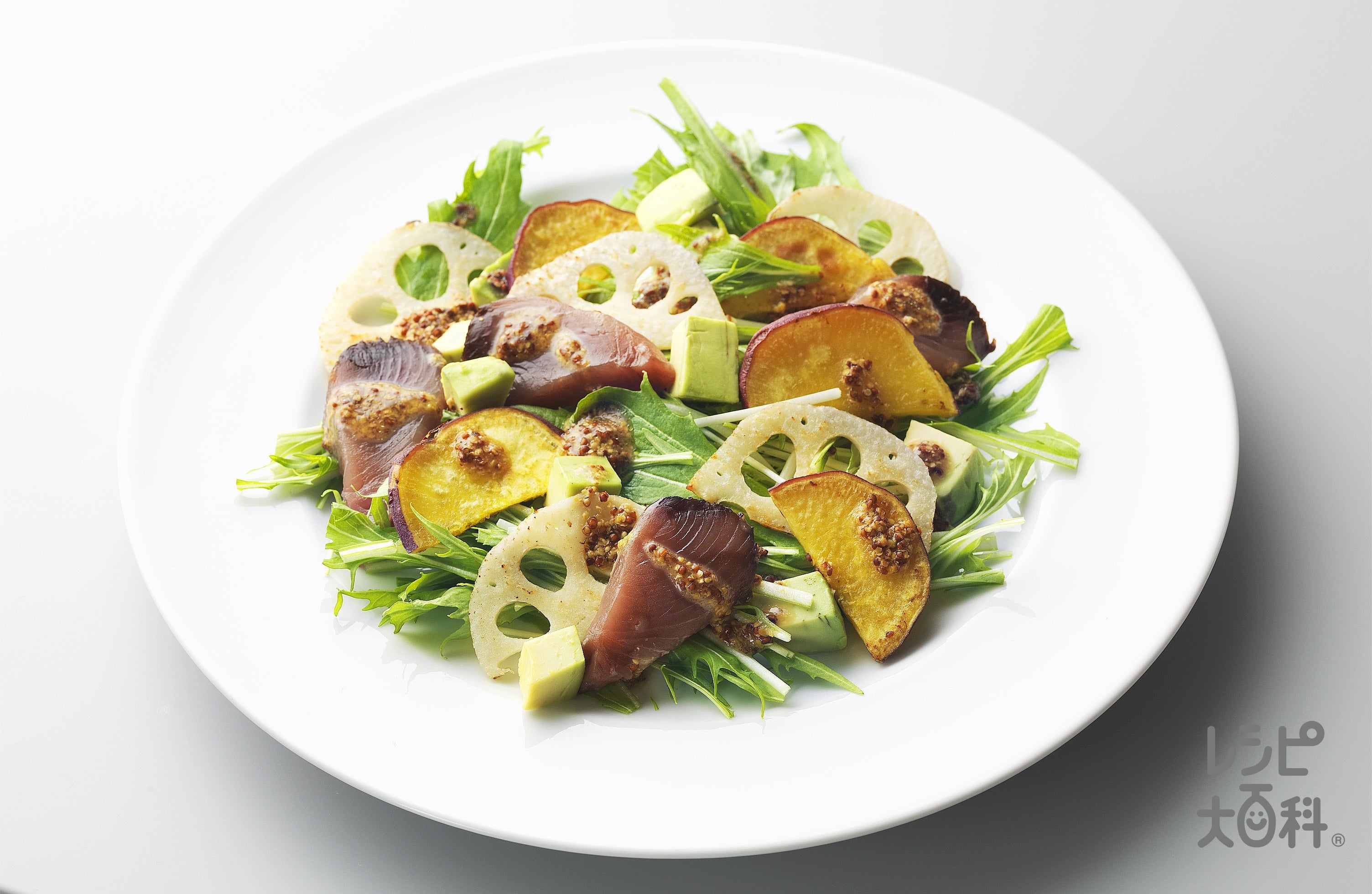 ③器に①の水菜・アボカド、かつお、②のさつまいも・れんこんを盛り、