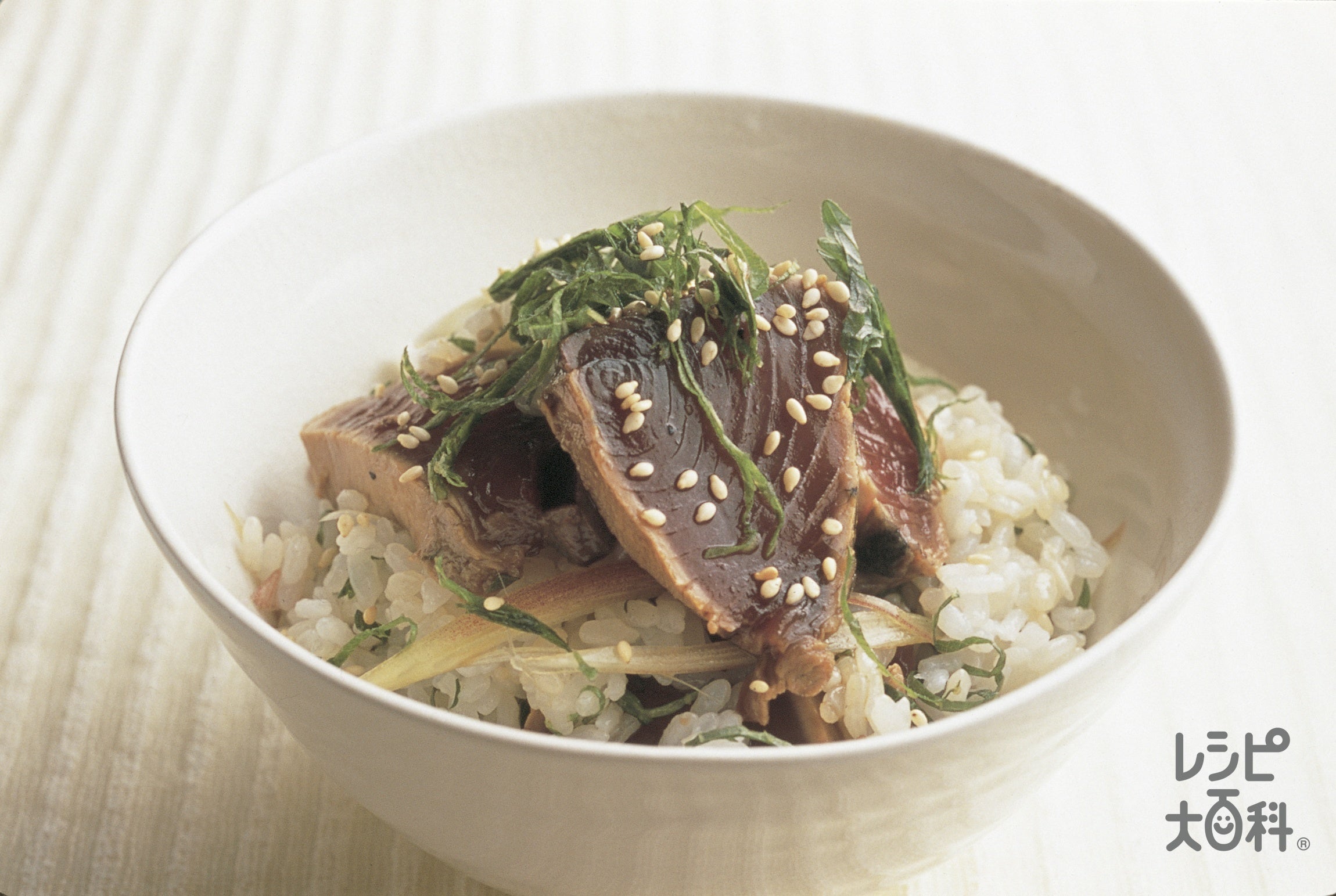 ⑦器に⑥を盛り、⑤のかつお、飾り用の青じそをのせ、上からごまを