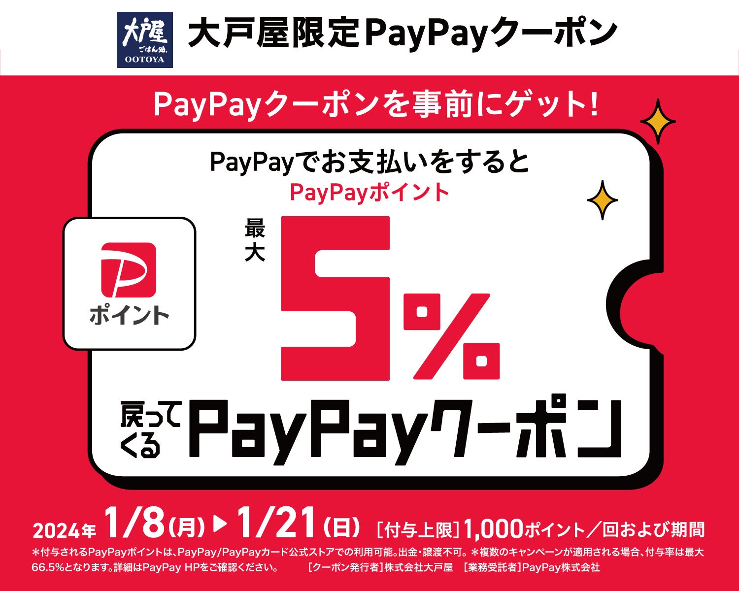 大戸屋ご利用でPayPay5%還元クーポン(一部店舗を除く)