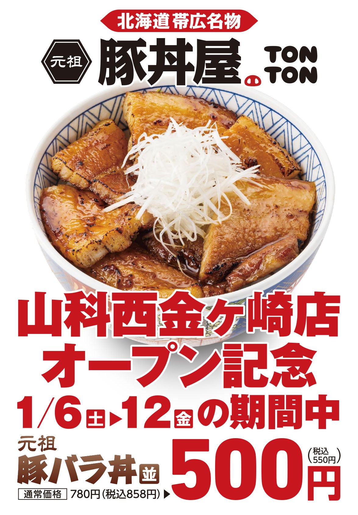 山科西金ヶ崎店のオープンを記念して、1/6(土)〜12(金)の期間に限り、TONTON自慢の「豚バラ丼〈並〉」をオトクな価格にて提供いたします。