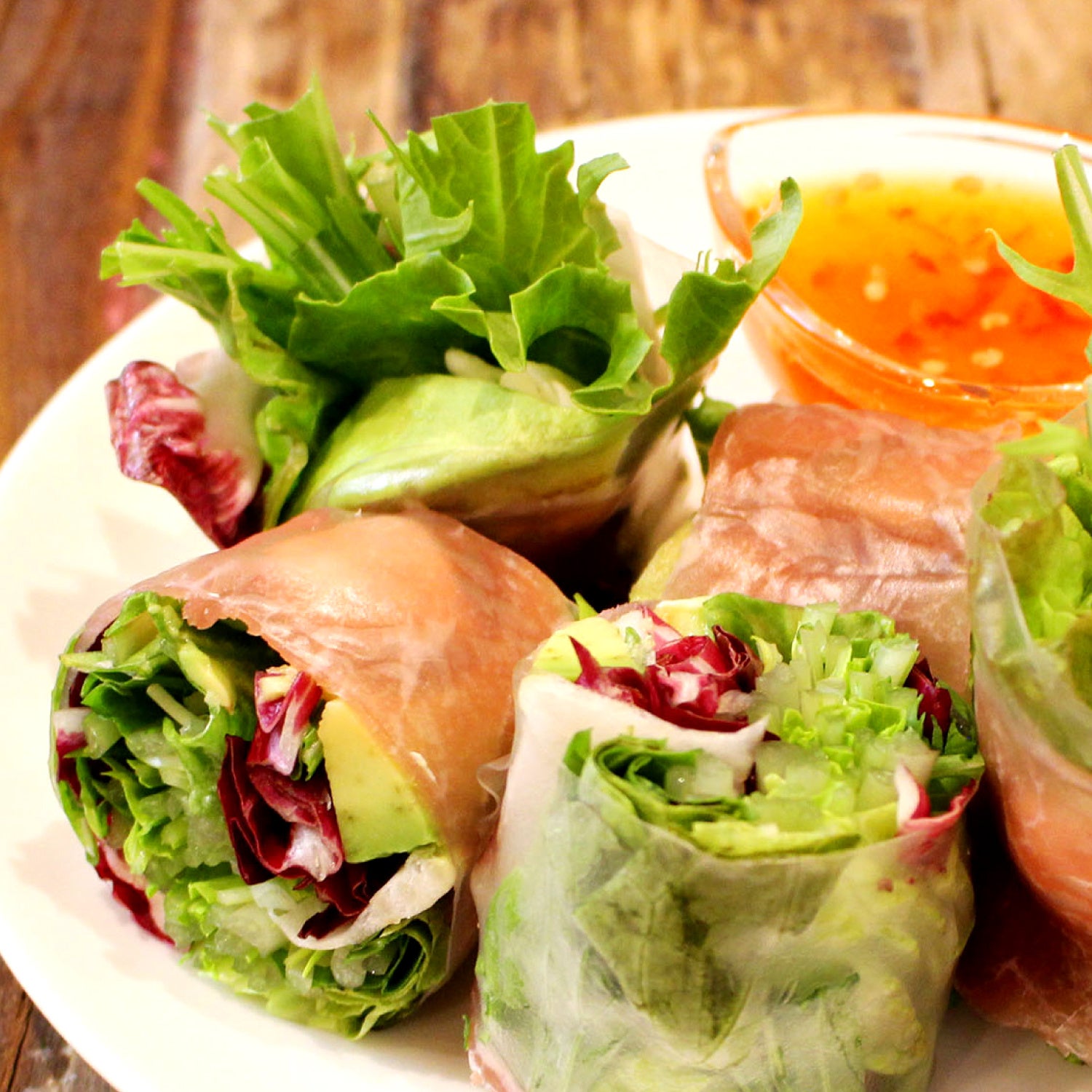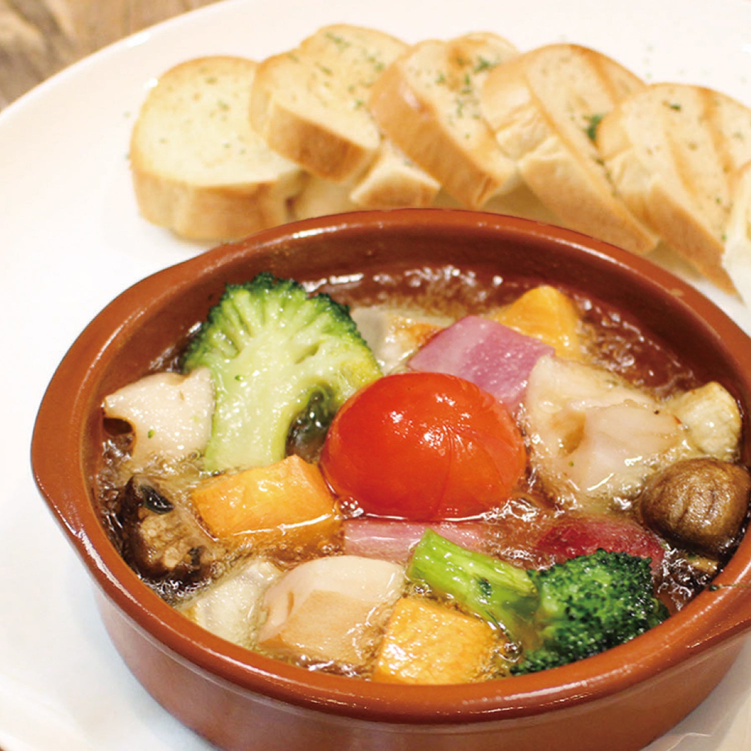 野菜をたっぷり使ったアヒージョ「ベジージョ」や「生ハムとアボカドの生春巻き」、「野菜チップス」、「ボイル野菜のディップ」、「れんこん、にんじん、ごぼうのピクルス」など、丁寧な下ごしらえで野菜の魅力を引き出し、素朴な味わいに仕上げたメニューで素材の味をお楽しみください。
