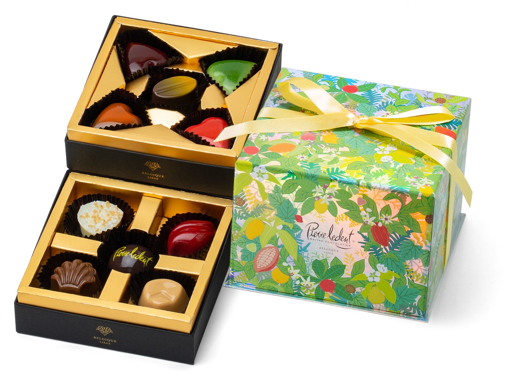 長年愛されているプラリネとキャラメルが2層になった「シュバリエ」や、クルスティヨンが乗った「クアージュ」など見た目も楽しいアソート。