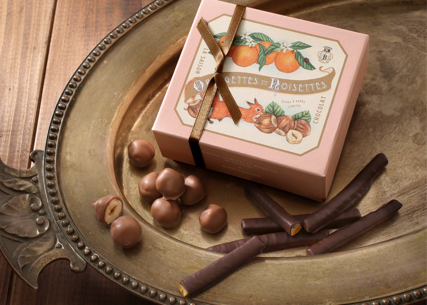 ほろ苦いオレンジピールにベルギー産スイートチョコレートをコーティングした「オランジェット」と、ミルクチョコレートをコーティングしたヘーゼルナッツをアソートにした期間限定のチョコレートギフト。