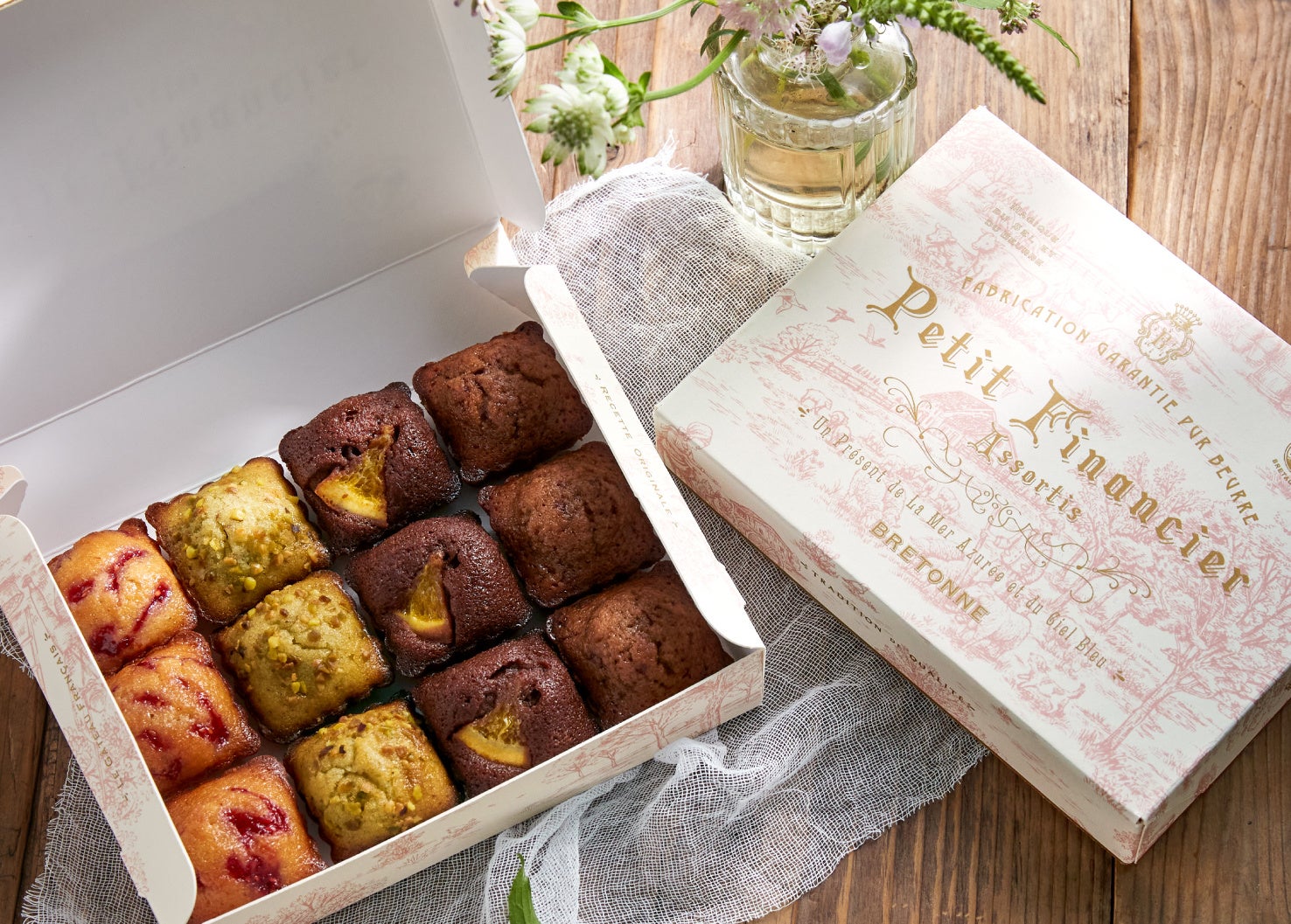 ひと口ふた口サイズに焼き上げたフィナンシェを、華やかなトワルドジュイ柄の限定パッケージに詰め合わせました。ショコラやピスタチオなど、3 つの限定の美味しさを合わせた4 種の味わいをお楽しみいただけます。