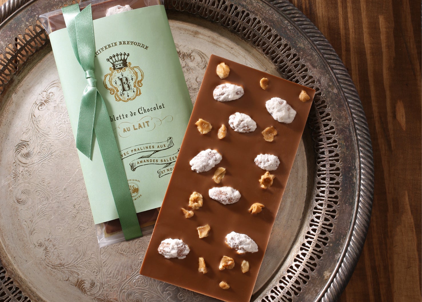 ベルギー産のミルククーベルチュールチョコレートに、ゲランドの塩の塩味がアクセントの糖衣がけしたアーモンド「プラリーヌ・オ・アマンド サレ」と、香ばしくローストしたヘーゼルナッツをのせたブルトンヌのオリジナルタブレット ショコラ。