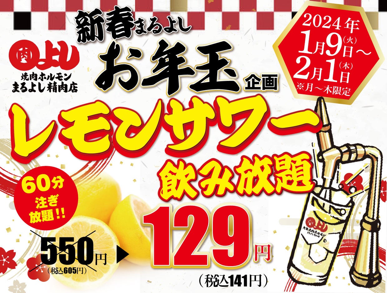 新春まるよしお年玉企画開催!レモンサワー飲み放題が60分129円(税込141円)!