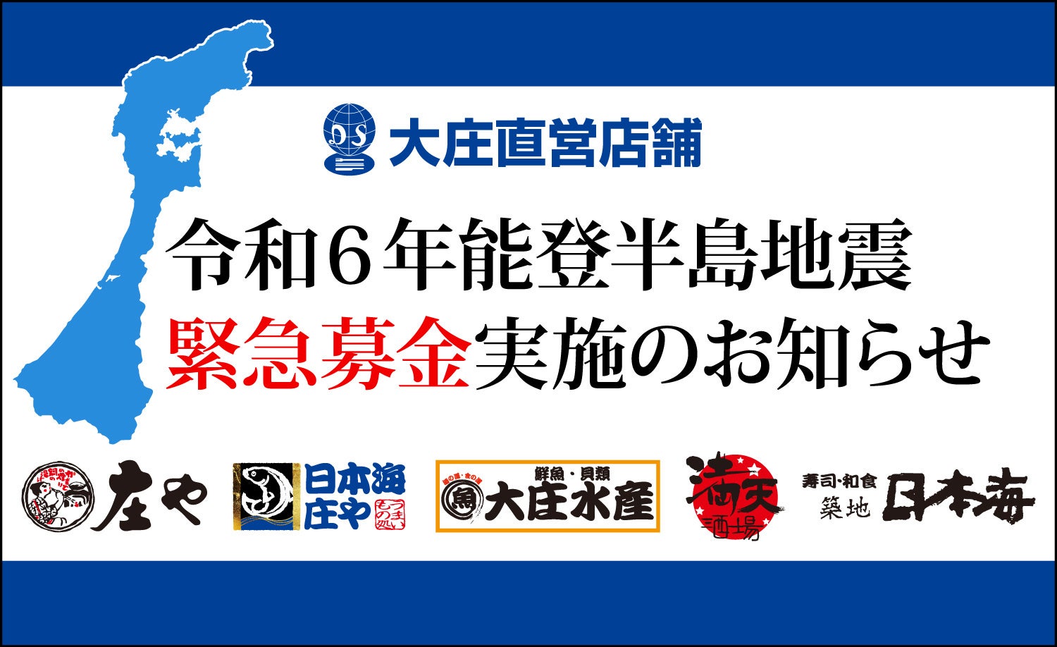 株式会社大庄は、この地震により被害にあわれた方々に支援を行うため、庄や・日本海庄やなどの直営店舗(一部フランチャイズ店舗にても実施)にて募金活動を実施いたします。