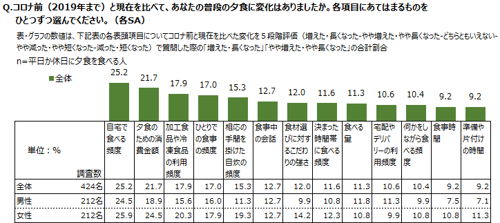 夕食に関してコロナ前と比べて「増えた・長くなった」の割合が最も高いのは「自宅で食べる頻度」で、「夕食のための消費金額」「加工食品や冷凍食品の利用頻度」「ひとりでの食事の頻度」が次いで高い。「自宅で食べる頻度」は男女の18~49歳で増えたが、男女の50~59歳ではあまり増えなかった。コロナをきっかけに若い世代や家族世代の自宅での夕食機会が増えている。また「ひとりでの食事の頻度」は男女の18~29歳で増えている。コロナで外での夕食が難しく自宅での夕食が増えたことで、友人知人との食事機会がなくなったことが主な要因と思われる。自宅での食事頻度が増えると家族と一緒の食事機会も増えるように推測するが、18~29歳では逆にひとりでの食事機会が増えている。自宅での夕食は必ずしも家族団らんの機会とはならない。