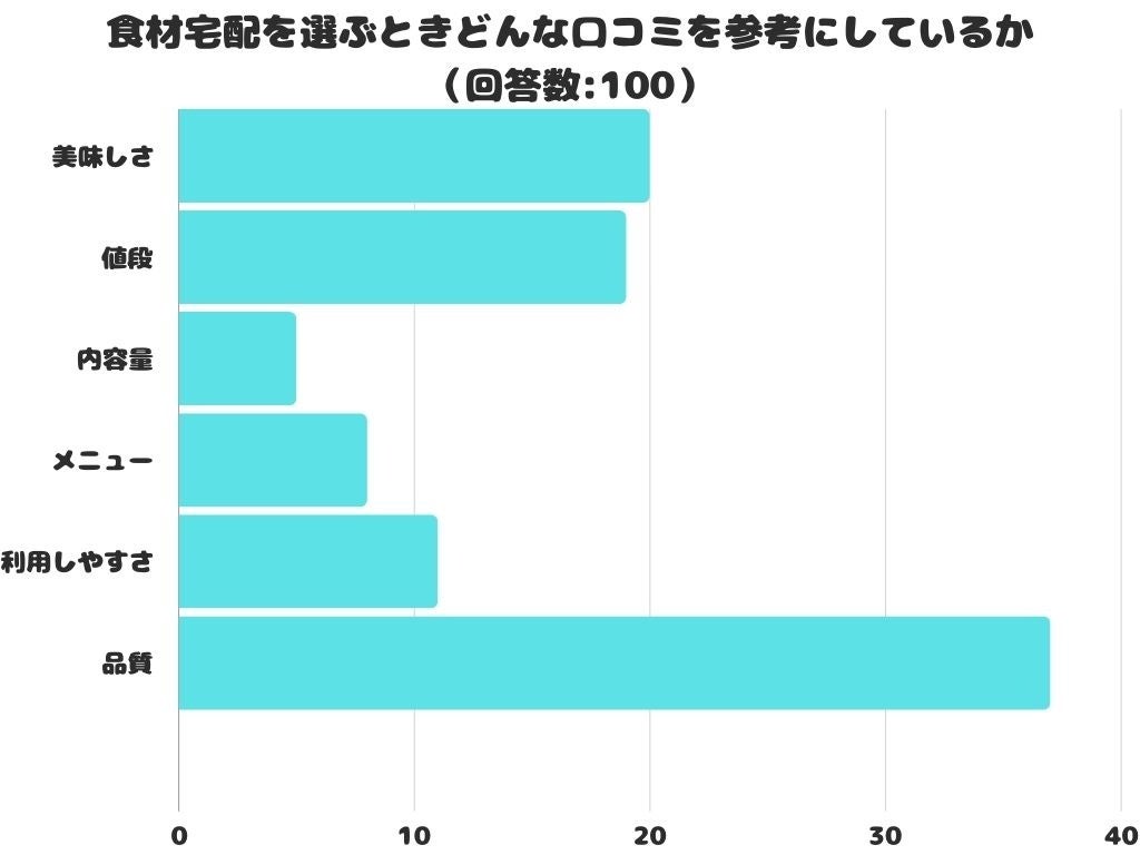 食材宅配のどんな内容の口コミを参考にするかをアンケートにて調査したところ、1位は「品質」でした。