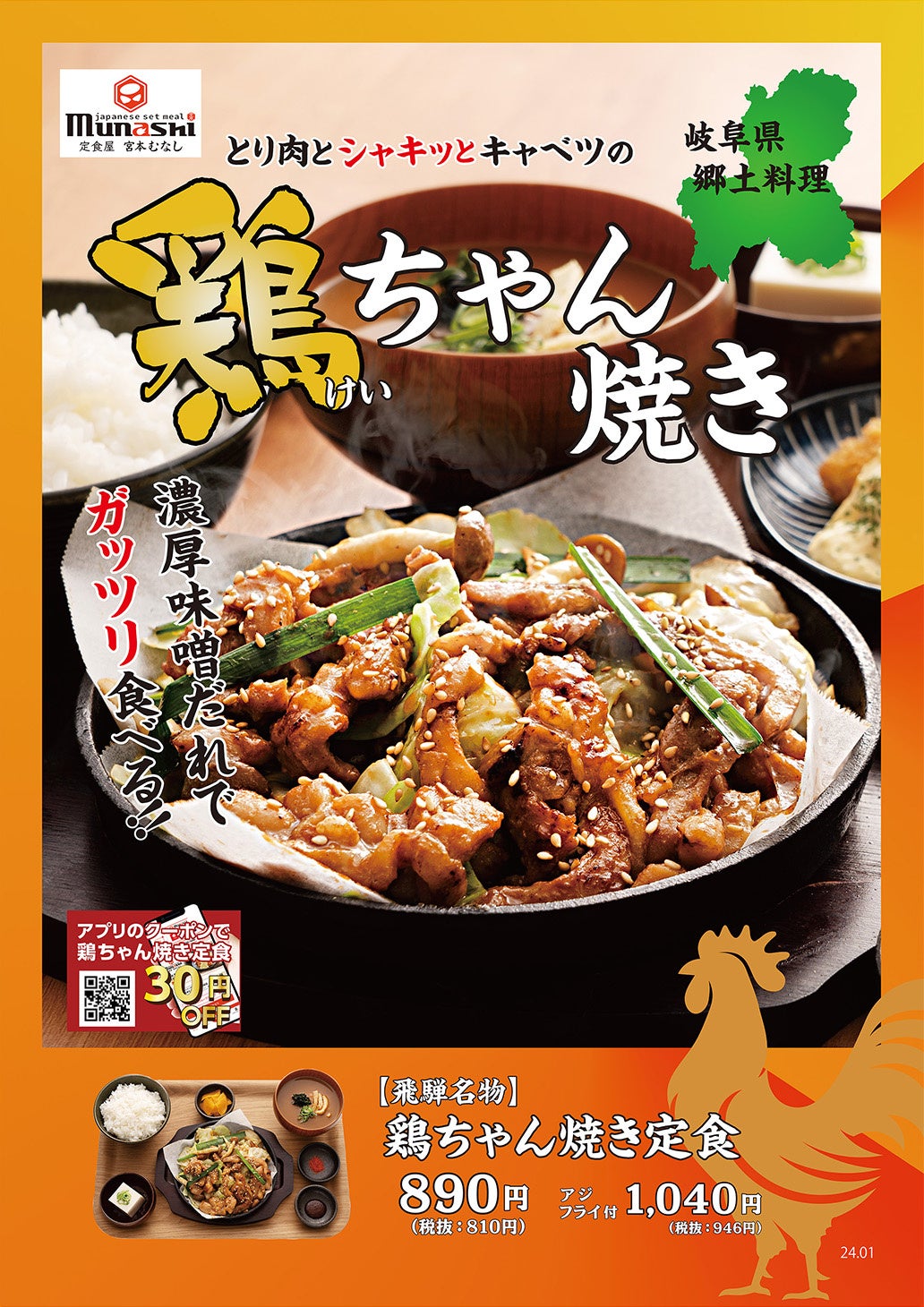 岐阜県南飛騨地方の名物料理「鶏ちゃん焼き」を宮本むなしの定食に仕立てた新メニュー。
