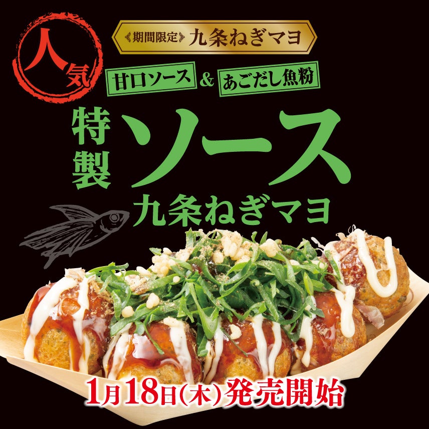 期間限定商品の中で圧倒的な人気を誇る 「九条ねぎマヨ」 は、特製の “甘口ソース”に、削り節、銀だこマヨネーズをかけ、たっぷりと “九条ねぎ” をトッピング!
