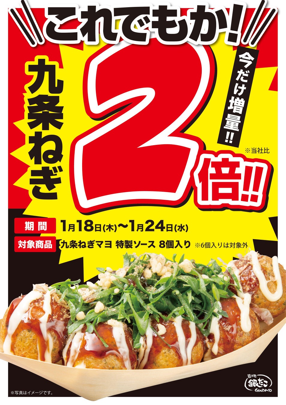 キャンペーン内容:『九条ねぎマヨ 特製ソース (8個入り)』のトッピングの九条ねぎが2倍‼(当社比)