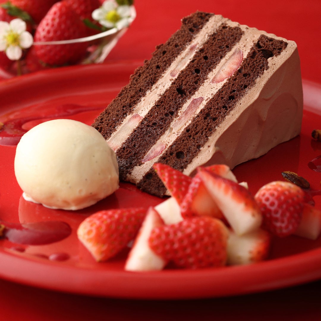 ショコラのクリームとスポンジを重ね、苺をサンドしたシンプルなショートケーキ。ほろ苦いカカオの風味と甘酸っぱい国産苺の相性が抜群です。