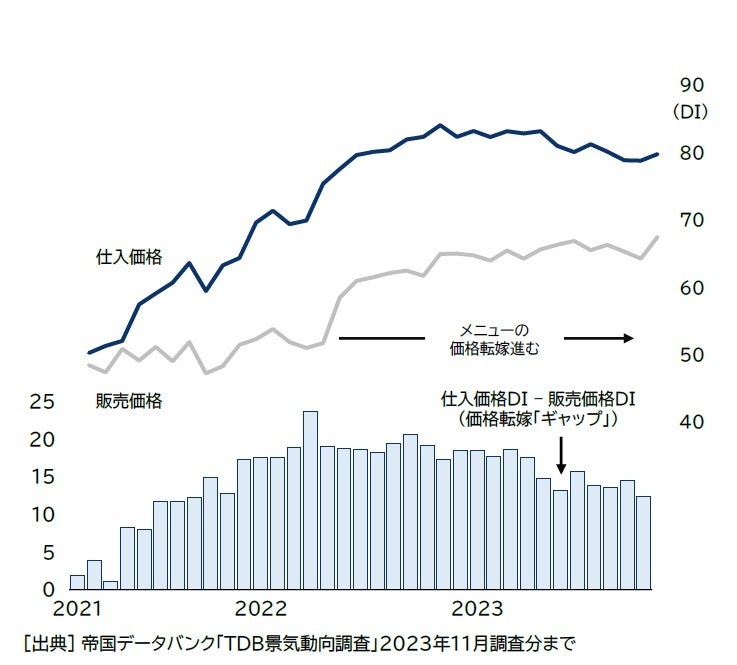 飲食店の倒産が増加した大きな要因の一つに、食材価格や電気・ガス代など「物価高」があげられる。仕入価格の上昇度を示す仕入価格DIは、食品の値上げが本格化した2022年以降、80を超える割合で推移した。一方、販売価格への転嫁(上昇)を示す販売価格DIは60~70前後で推移しており、仕入価格の上昇が販売価格への転嫁を上回った状態が続いている。足元ではメニューの値上げも進んでいるものの、頻繁な価格改定が客離れを招きかねないとの懸念も根強く、コストアップとの「我慢比べ」が2023年中により鮮明となった。