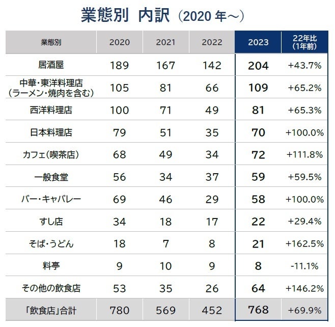 飲食店の倒産、2023年は768件発生 前年から7割増 「居酒屋」「カフェ」は過去最多