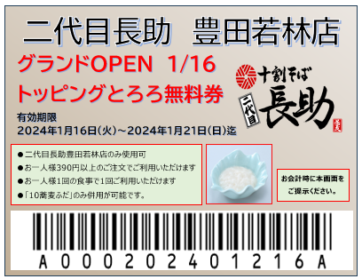 また、グランドオープンを記念して、二代目長助豊田若林店限定でご利用いただけるトッピングとろろ無料券を記載いたしました。