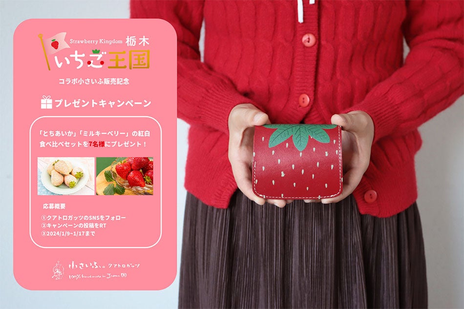 大阪府茨木市で革小物の製作・販売をするクアトロガッツ (代表:中辻大也 ナカツジヒロヤ)は、公式HPにて「いちご王国・栃木県」コラボのミニ財布を発売。価格は14,800円(税込16,280円) 栃木県産の「とちあいか&ミルキーベリー」が当たるキャンペーンも開催いたします。 詳細はこちら https://bit.ly/489CDud