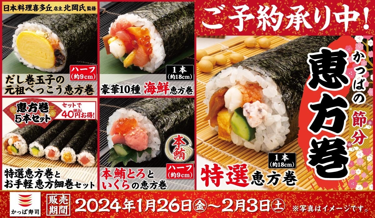 2024年は、かっぱ寿司人気の「いかサラダ」(サラダ軍艦のネタ)が入ったかっぱ寿司の恵方巻定番商品である『特選恵方巻』、広島を代表する日本料理店「日本料理 喜多丘」の店主 北岡三千男氏に監修いただいた『だし巻玉子の元祖べっこう恵方巻』、最高級品「本鮪」を堪能できる『本鮪とろといくらの恵方巻』、海鮮など10種の具材を贅沢に使用した『豪華10種 海鮮恵方巻』の他、定番メニューの細巻を『恵方細巻』として一本で提供するお得なセットをご用意しております。