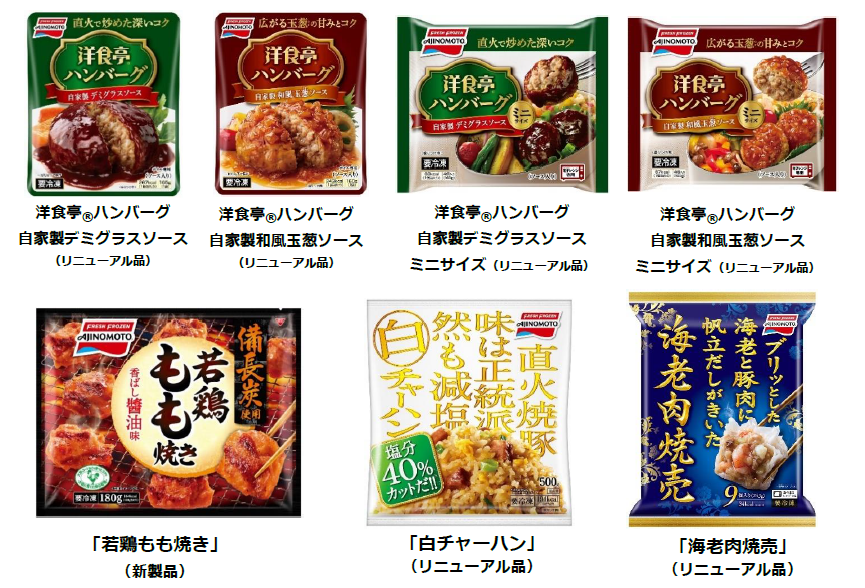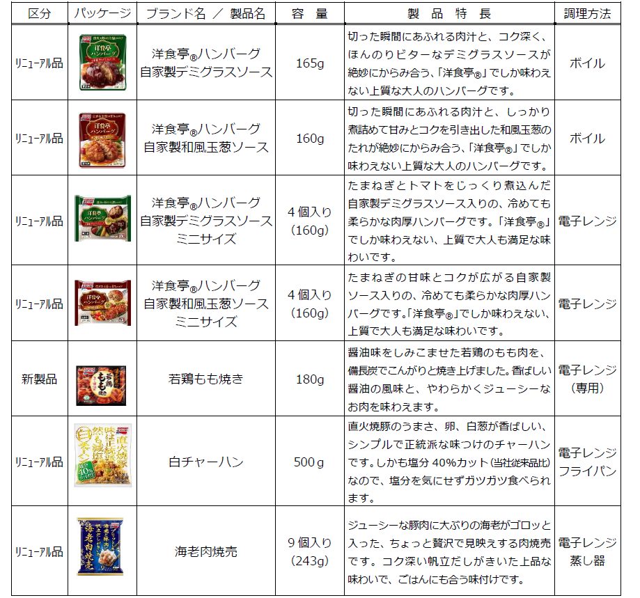「洋食亭®」シリーズは、「洋食亭®」ブランドをさらに認知いただけるよう、ブランドロゴを「洋食亭®ハンバーグ」に統一し、製品名とパッケージデザインを全面改訂します。また、「洋食亭®ハンバーグ 自家製 デミグラスソース」に使用しているデミグラスソースは、従来品の濃厚なビターな味わいはそのままに、マッシュルームブイヨンを加え、うま味、コク、苦味のバランスを向上させました。