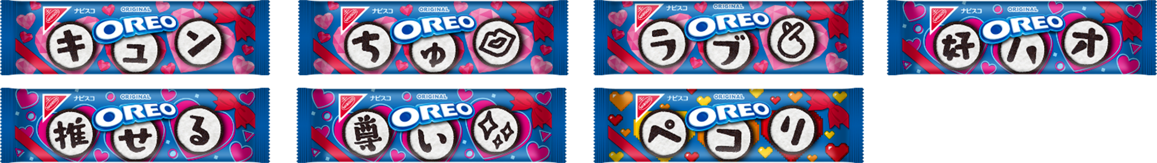 3枚入りの個包装にちなんで、3文字メッセージがパッケージに入ったバレンタイン限定「オレオ メッセージパック バニラクリーム」は、個包装のデザインが全部で15種類*あり、1パックにランダムに3種類が入っているので、バレンタインのギフト交換にぴったりです。