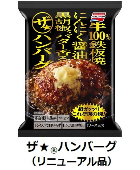 「ザ★®ハンバーグ」は、牛100%・鉄板焼き仕上げで、肉のうま味を堪能でき、にんにく醤油、黒胡椒、バター香るソースが絶妙にからむ、白飯が猛烈に進むハンバーグです。食べ応えやおいしさはそのままで、肉の配合を変更することで、より肉汁を感じるジューシーなハンバーグにリニューアルしました。