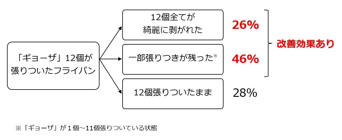 ※「ギョーザ」12個全てがフライパンに張りつく状態から、12個全て張りつかずに綺麗に焼けたフライパンの割合 当社調べ