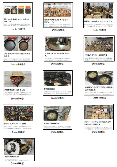 『冷凍餃子フライパンチャレンジ』プロジェクトサイトに連動した「note」( https://note.com/ffa_frypan)では、お送りいただいたフライパンの開梱作業の様子や、フライパン検証の進捗をご報告する記事を更新しています。