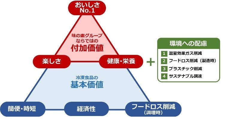 コロナ禍以降、生活者のライフスタイルの変化により、「日々の献立検討への疲れ」や「休日はおうちで食事を楽しむ」といった、生活者の食生活への意識も急速に変化し、またシニア層の需要もますます拡大しています。当社はこのような変化や生活者の悩みに対応し、当社冷凍食品の独自価値である「おいしさNo.1」「楽しさ」「健康・栄養」「環境への配慮」を具現化した製品の発売や取り組みを強化し、冷凍食品をまた一つ進化させ、日々の豊かな食生活を応援します。