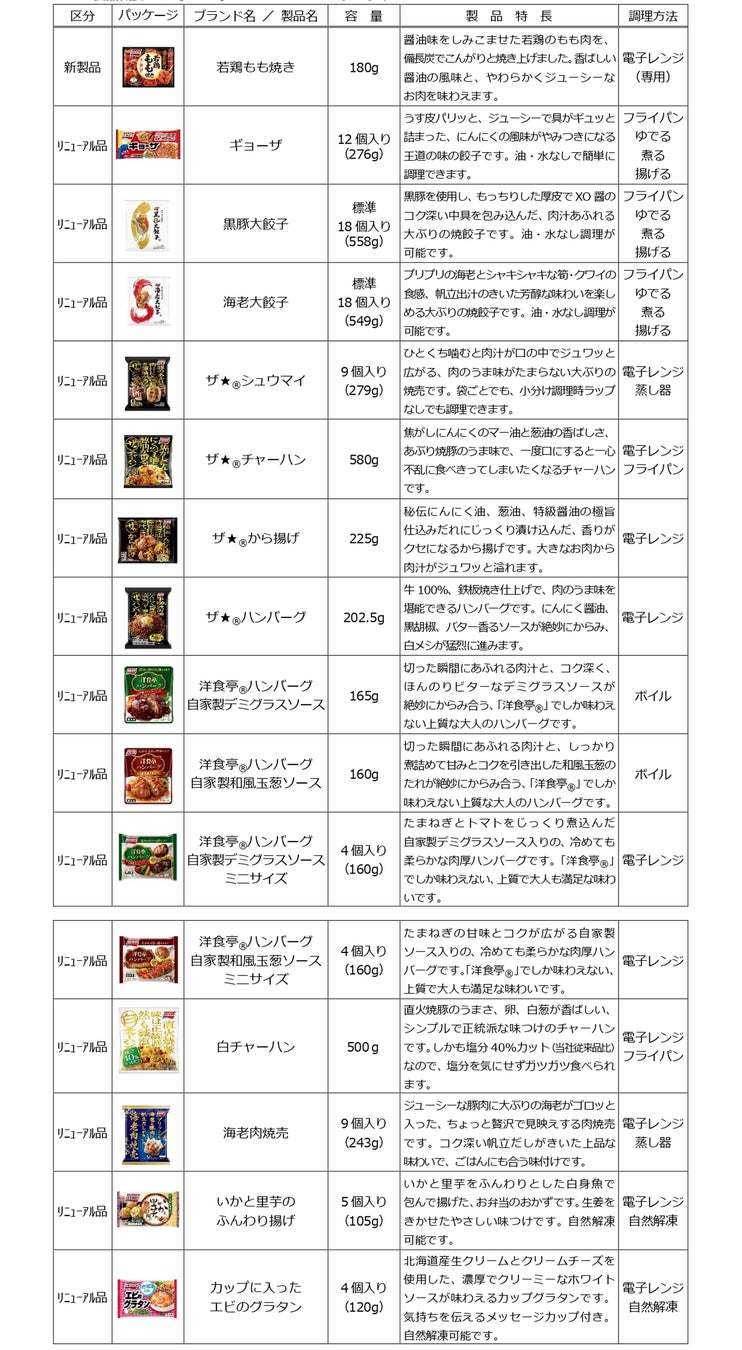 今回の24春季新製品・リニューアル品では、当社の独自価値の中の特に「おいしさNo.1」と「楽しさ」において、永久改良を続ける「ギョーザ」の調理性向上や、おうちで外食品質を楽しめる「ザ★®」シリーズの全面刷新を行います。またシニア層の方々も手軽に 楽しく喫食できる、備長炭で焼き上げた「若鶏もも焼き」を発売します。