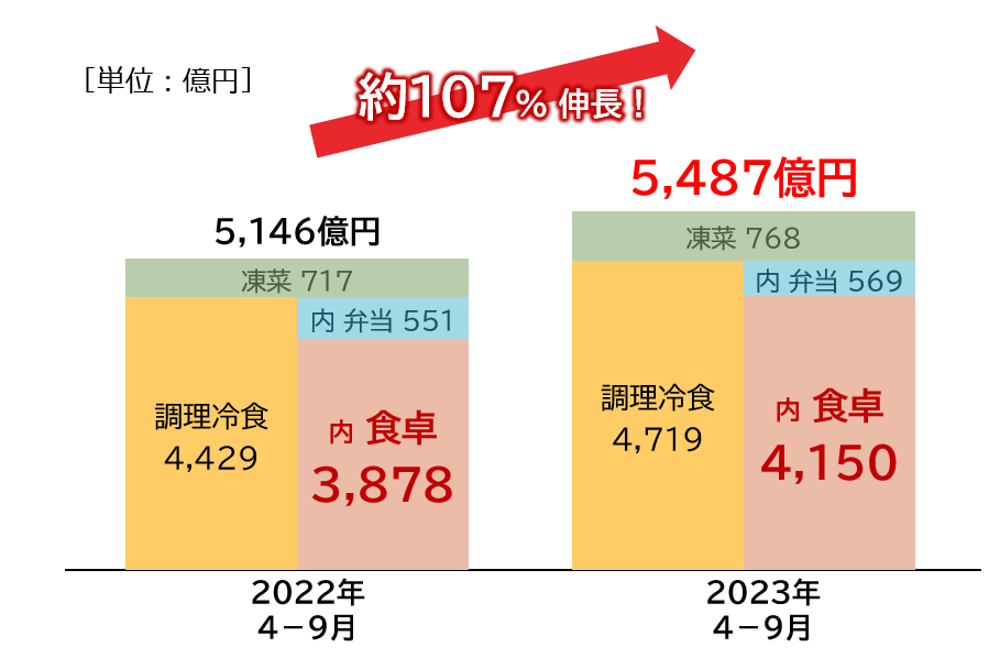 2023年上期の冷凍食品市場規模は5,487億円で、前年同期比で約107%と伸長しており、冷凍食品市場規模は堅調に推移しています。特に食卓品は約107%と拡大を続け、市場を牽引しています。※