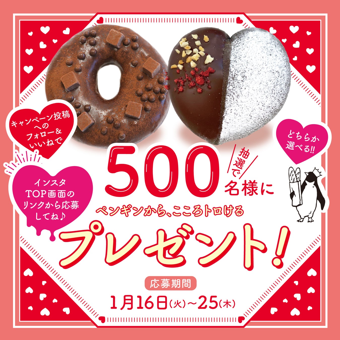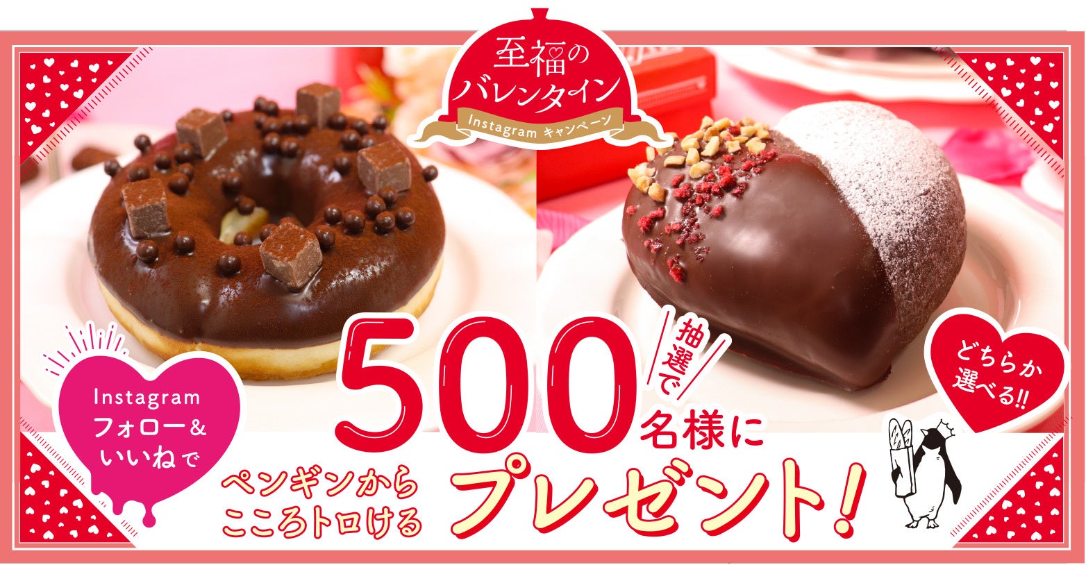 ペンギンベーカリー公式Instagramへのフォロー&いいね!で、ペンギンベーカリー「至福のバレンタインフェア」の「プチもちべえショコラ」と「バレンタインショコラ」のいずれか1個を抽選で500名様にプレゼントいたします! 応募方法は下記の通りです。沢山のご応募お待ちしております。