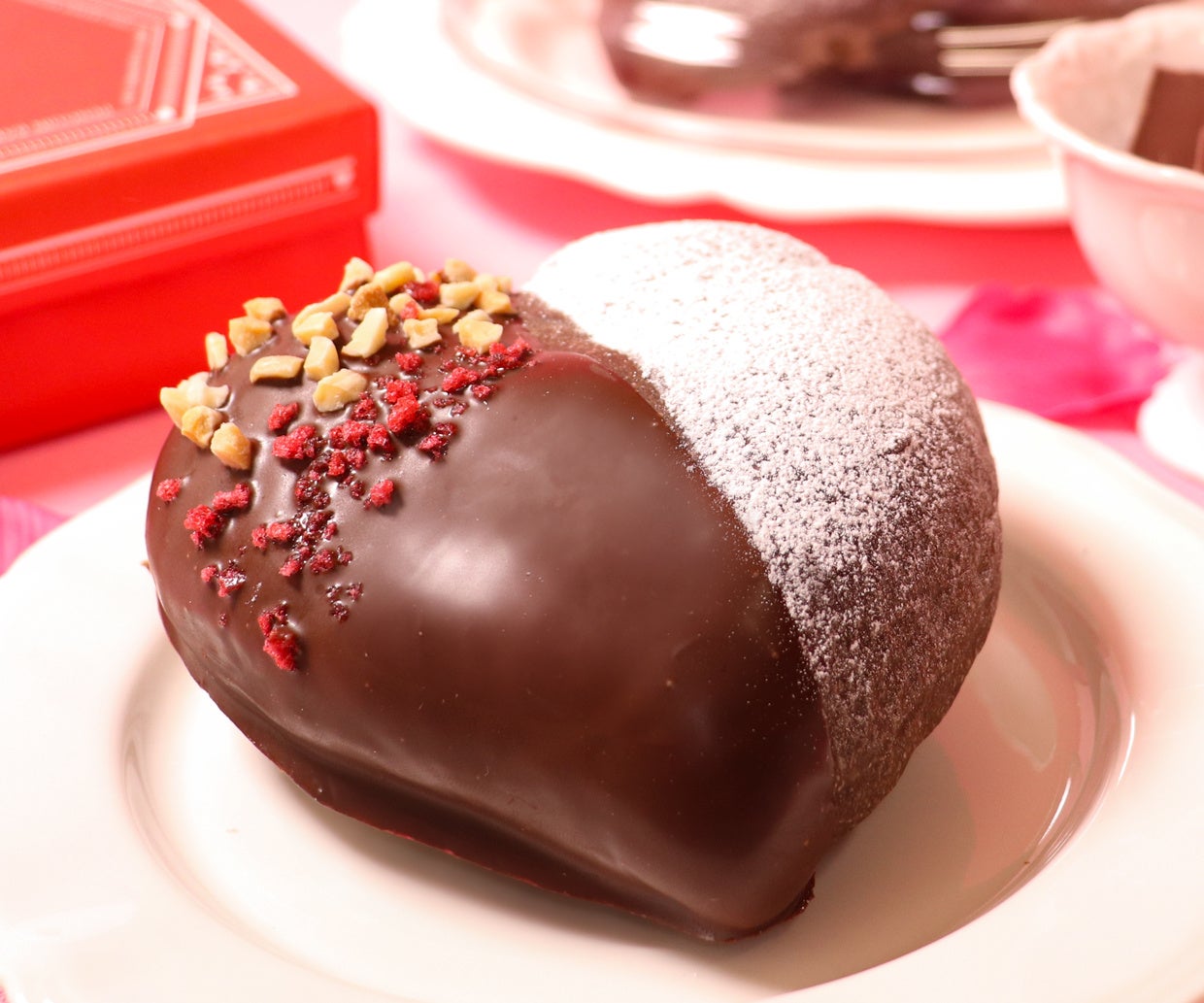 商品特徴:スイートなハートの生地の中にチョコレートクリームを包み、さらにチョコレートでコーティング。アーモンドとラズベリーフレークを添えた甘酸っぱい香り漂うショコラパンです。