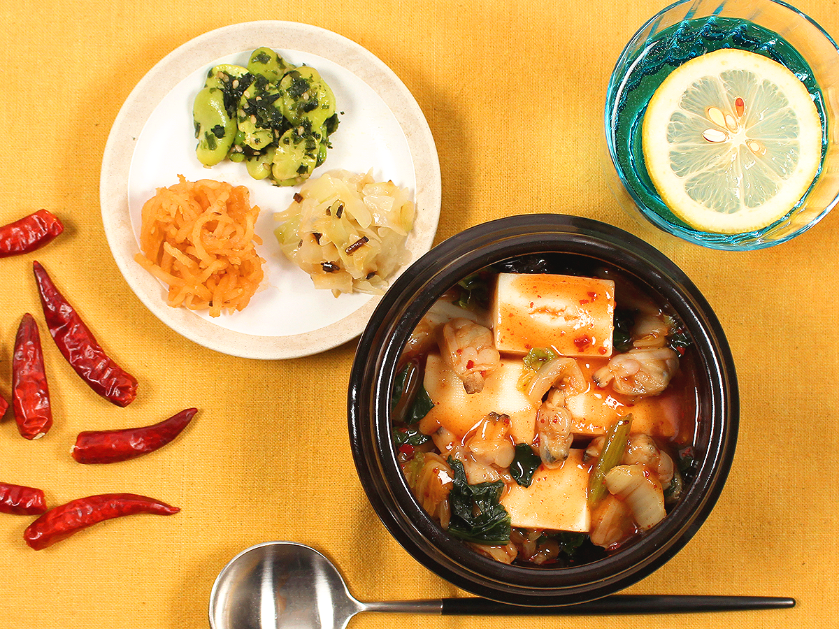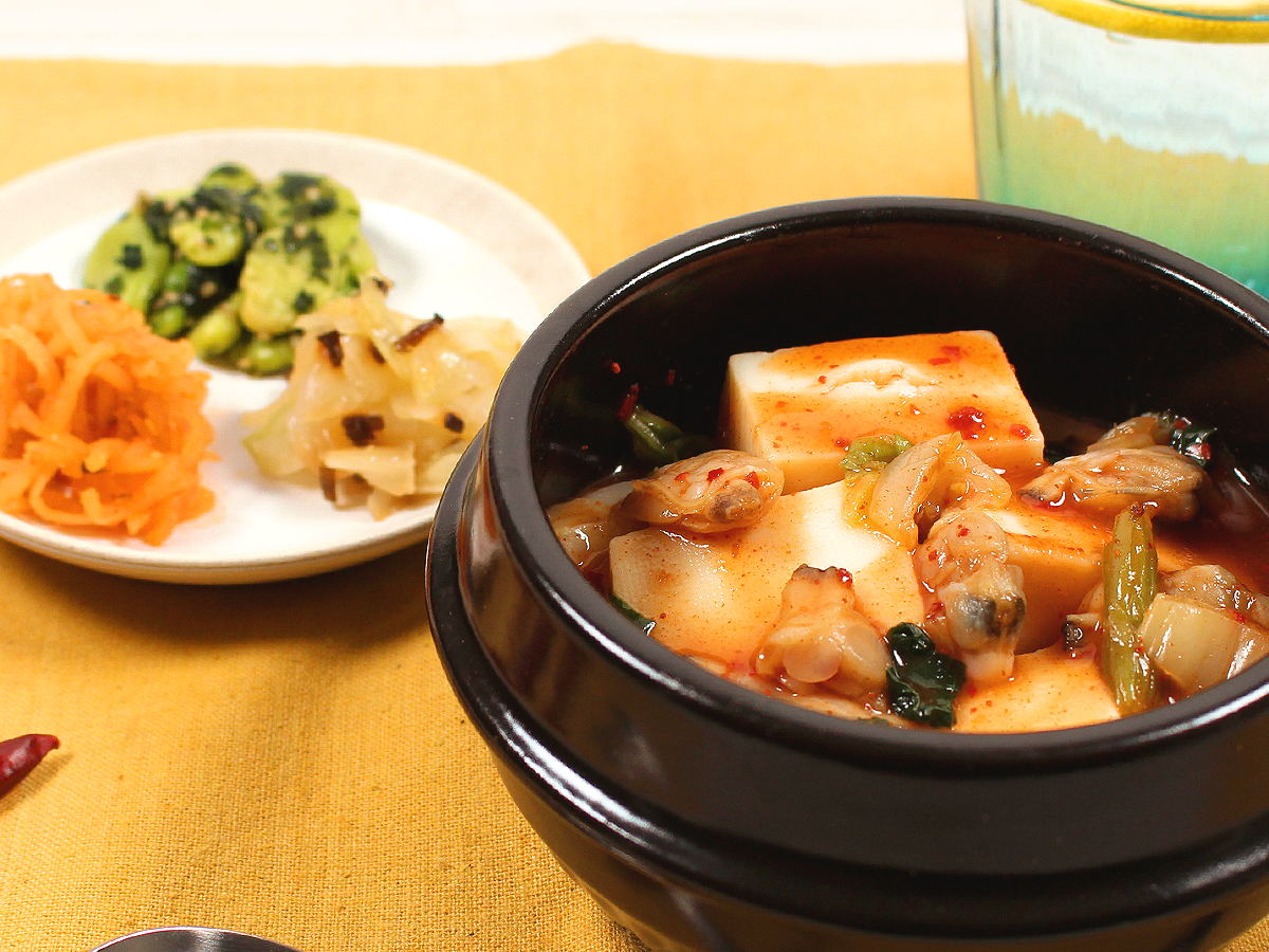 コチュジャンの辛味と干し貝柱や香味野菜の旨み、コク豊かに仕上げたスープが決め手のスンドゥブチゲです。具材には、絹ごし豆腐、白菜、小松菜、アサリを使用しております。海鮮の旨味と絹豆腐のプルプル食感をお楽しみください。