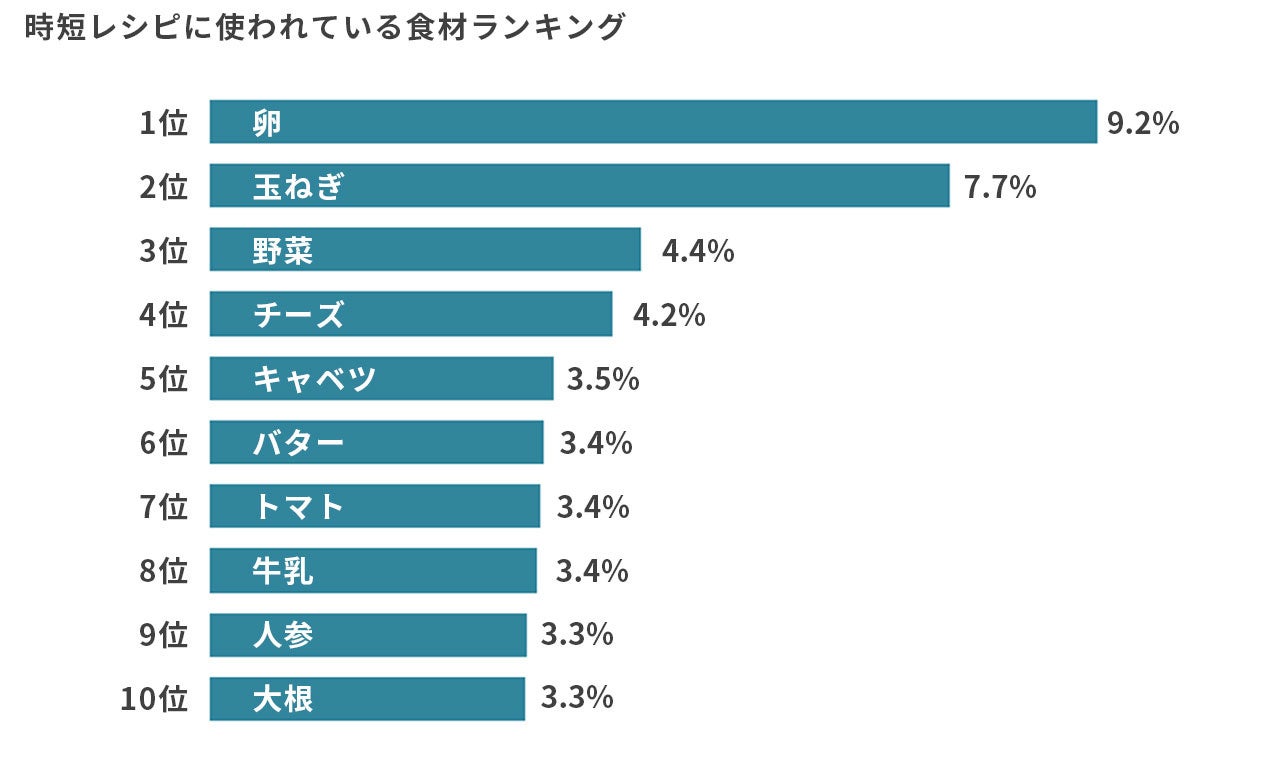 どんな料理とも相性が良く、幅広くアレンジしやすい食材がランクイン。肉、魚よりも卵、そして野菜類がよく使われていることがわかります。野菜は生でも加熱してもおいしく食べられ、保存に便利な冷凍野菜や洗わずに使えるカット野菜などが時短にも繋がり、近年の商品ラインナップも拡大しつつあります。