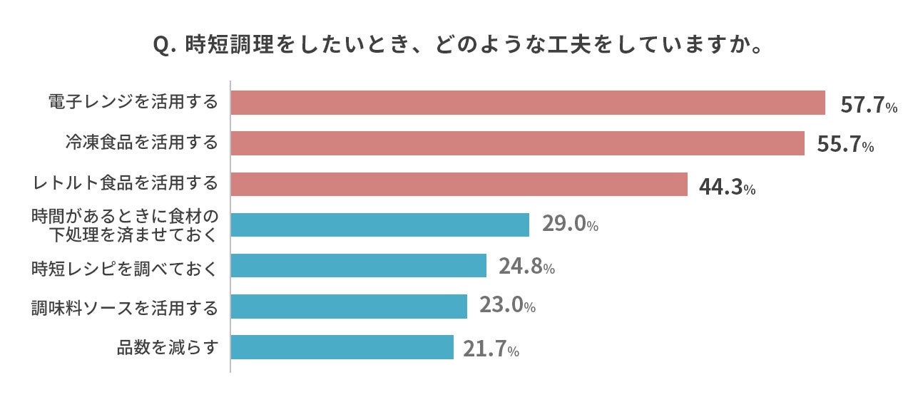 次に「時短調理のために工夫していること」を聞いたところ、「電子レンジの活用(57.7%)」が最も多く、次いで「冷凍食品の活用(55.7%)」、「レトルト食品の活用(44.3%)」という結果となりました。多くの人が時短調理を実現するグッズや食品を積極的に活用しているということがわかります。一方で、時間があるときに食材の下処理を済ませておく(29.0%)、時短レシピを調べておく(24.8%)など、アイテムに頼らずにできる工夫を実践しているという人も一定数いるということもうかがえます。
