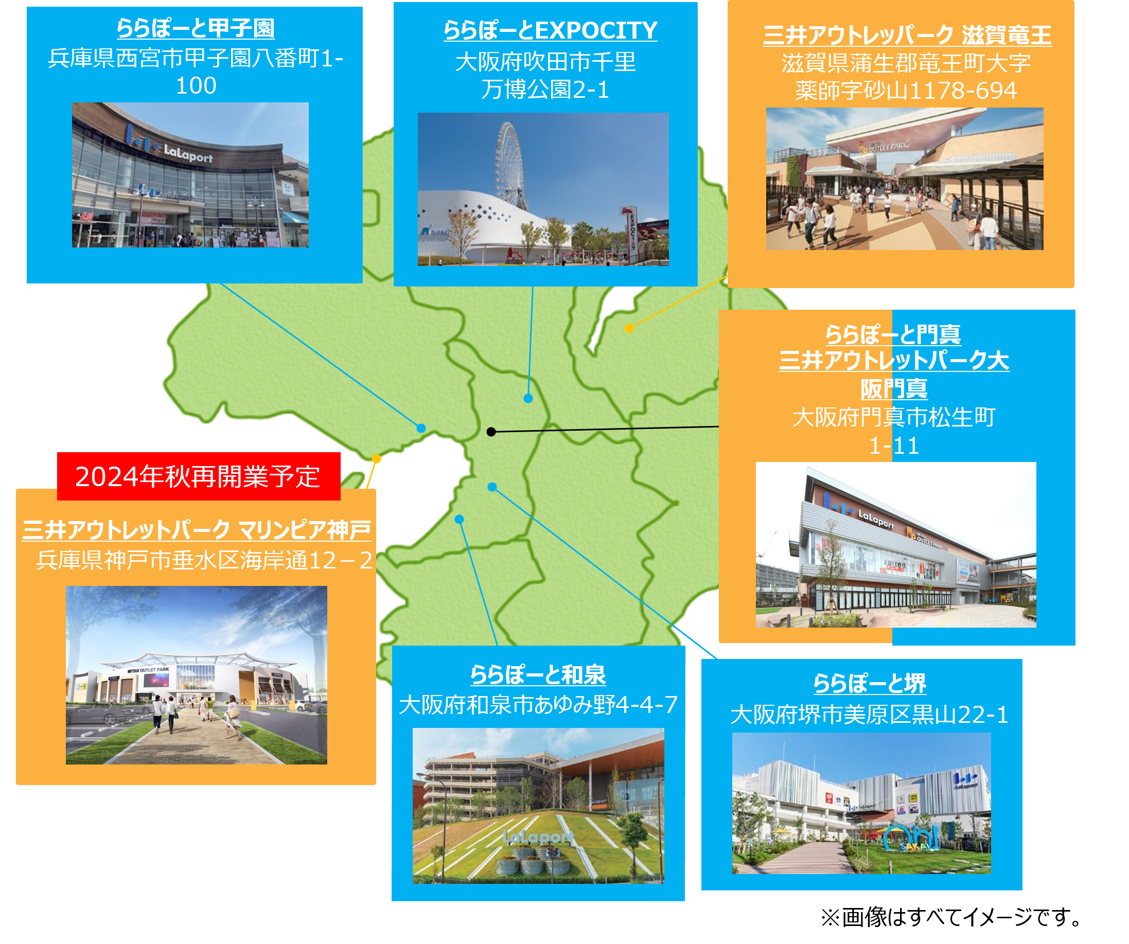 大阪門真、滋賀竜王、マリンピア神戸(2024年秋再開業予定)