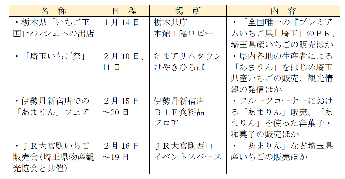 また、今シーズンは埼玉県産いちごの魅力発信のため、様々なイベントを開催します。是非、埼玉県のおいしいいちごを味わってみてください。