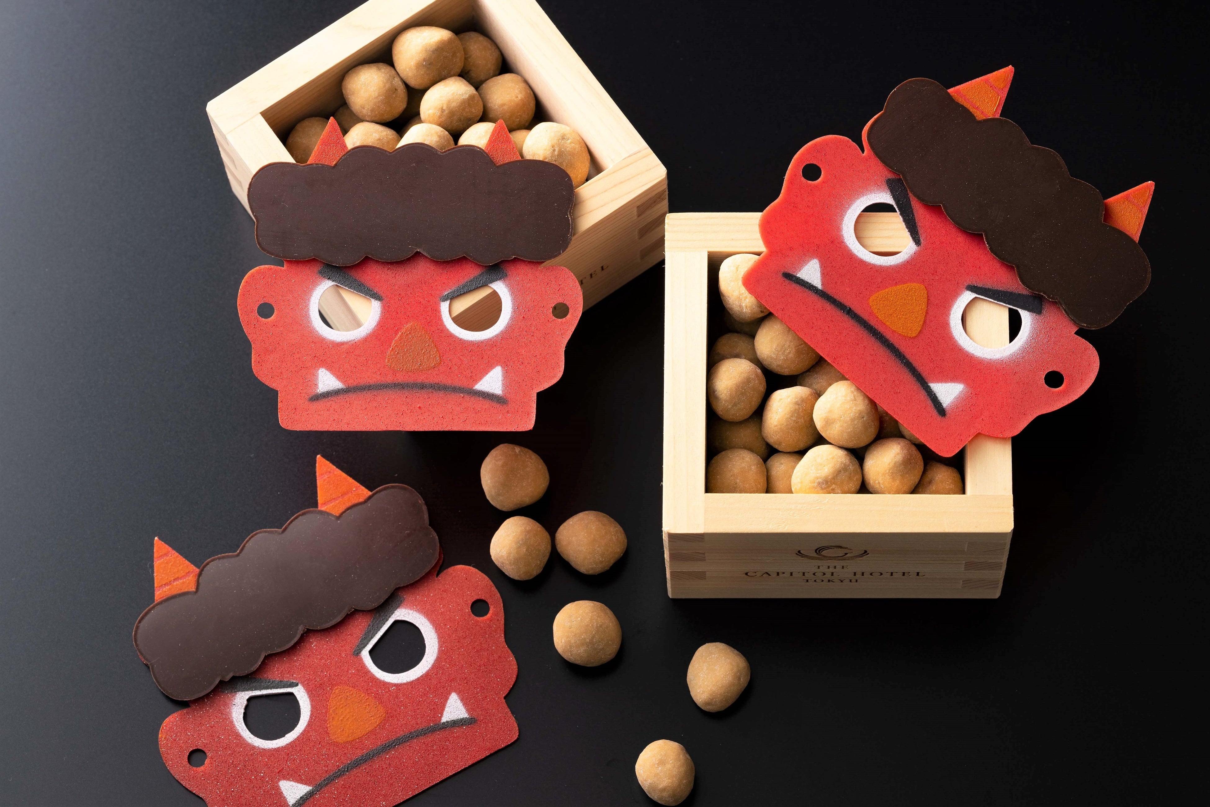 容器は、SDGsの観点より再利用できる升を採用。当ホテルのロゴと今年の干支(えと)の「辰(たつ)」の焼き印を押したオリジナルの升に、たっぷりと福豆を入れてご用意いたします。イチゴチョコレートとビターチョコレートを使い、一つひとつ手作業で仕上げる鬼のお面を添えた、シェフパティシエの遊び心あふれる節分スイーツです。