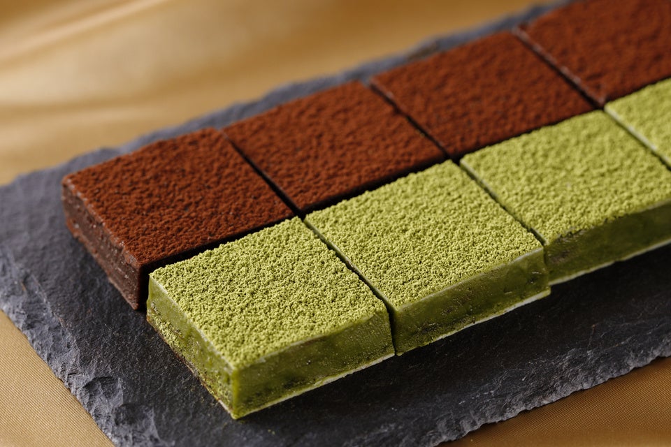 口の中でとろける濃厚なホワイトチョコレートと、香り高い愛知県西尾産の抹茶を合わせました。ビターなダークチョコレートのプレーンガナッシュもご一緒に