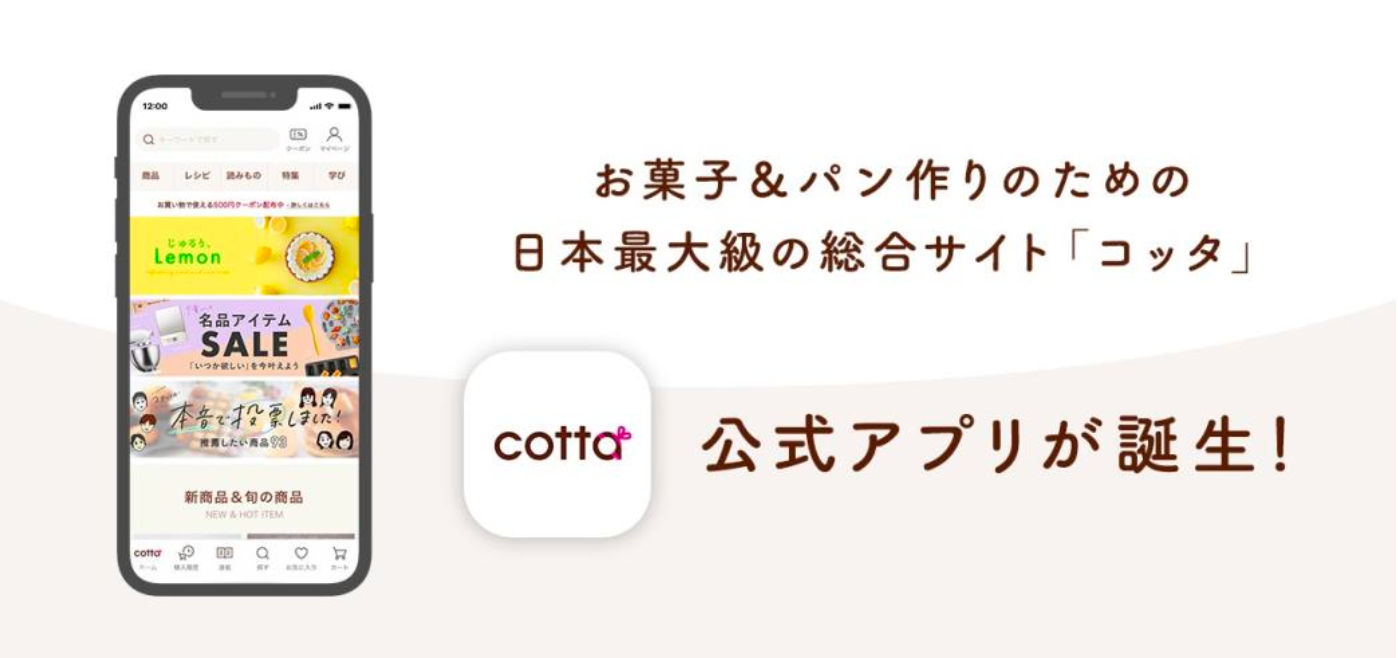 日本最大級の製菓・製パンECサイト cotta(コッタ)は、自社開発を含む製菓製パン材料・資材の小ロット販売を強みとし、約2万点以上の商品と、約1.5万件のレシピを有する日本最大級のお菓子・パン作りのメディアです。法人、個人あわせて会員数約200万人(2023年9月時点)、月間アクセス数2100万PVを誇り、お菓子やパン作りを愛する多くの方に親しまれています。