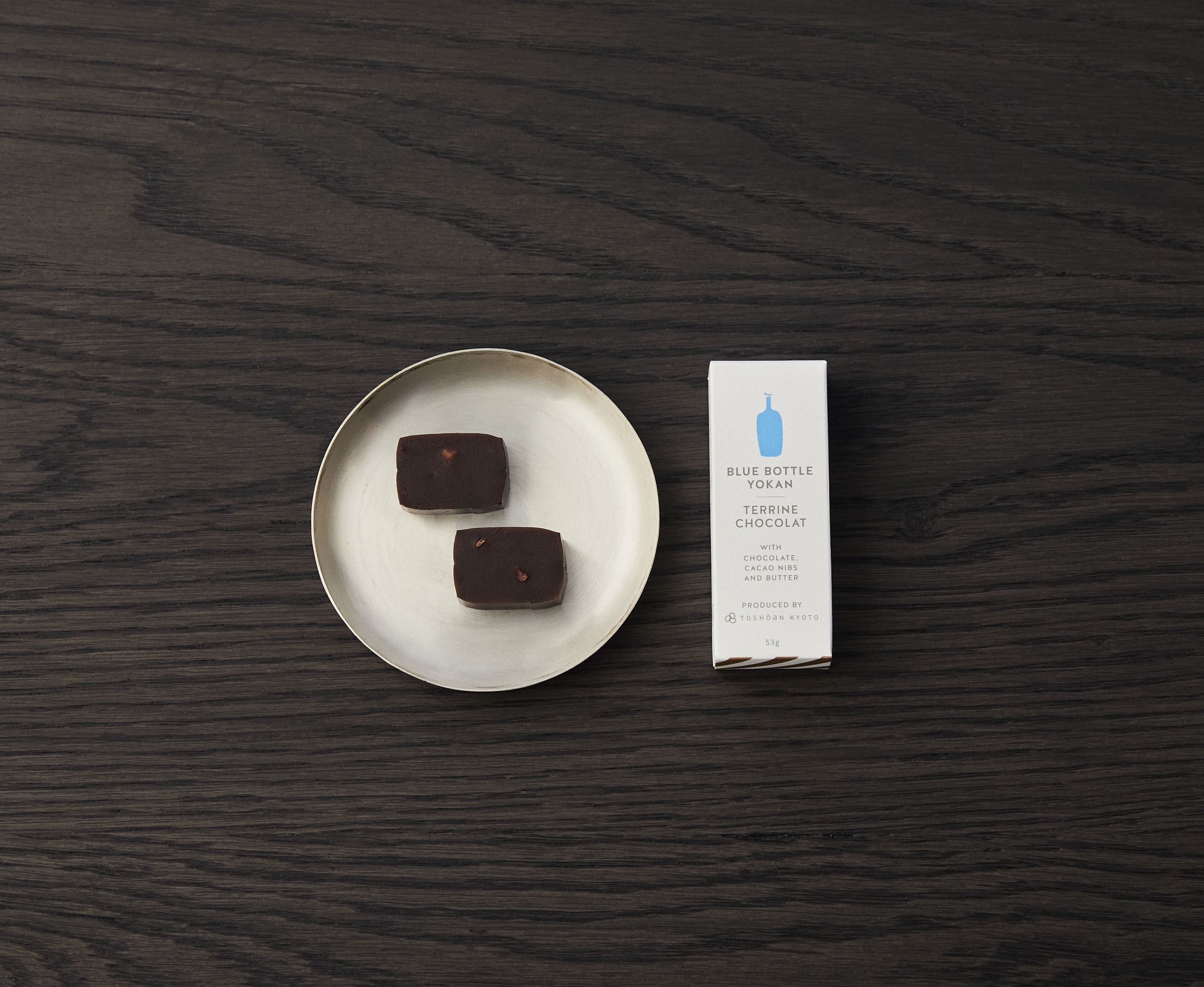 京都堀川三条で70年以上続くあんこ屋「都松庵(としょうあん)」とコラボレートした、コーヒーのための羊羹「ブルーボトル 羊羹」。テリーヌ ショコラは、白生あんにチョコレートとバターを合わせた新たな組み合わせの羊羹です。カカオ成分99%のクーベルチュールを贅沢に使用しており、口に入れた瞬間にチョコレートの風味が口いっぱいに広がります。あんこの歯触りと風味もしっかりと感じられる、ユニークな羊羹に仕上がりました。チョコレートとの相性を考え、ワインを醸造するブドウの搾りかすで作るブランデー「マール」の中でも最高峰の「マールドシャンパーニュ」を使用し、さらにその味わいを深めています。ぜひ、大切な方やお世話になっている人へのギフト、ご自分へのご褒美としてお楽しみいただけると嬉しいです。