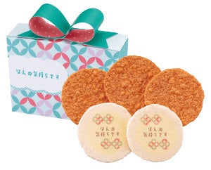 リボン型のかわいいパッケージにえびの旨みを凝縮した赤えび炙り焼きと、メッセージ入りのえびせんべいを詰め合わせました。