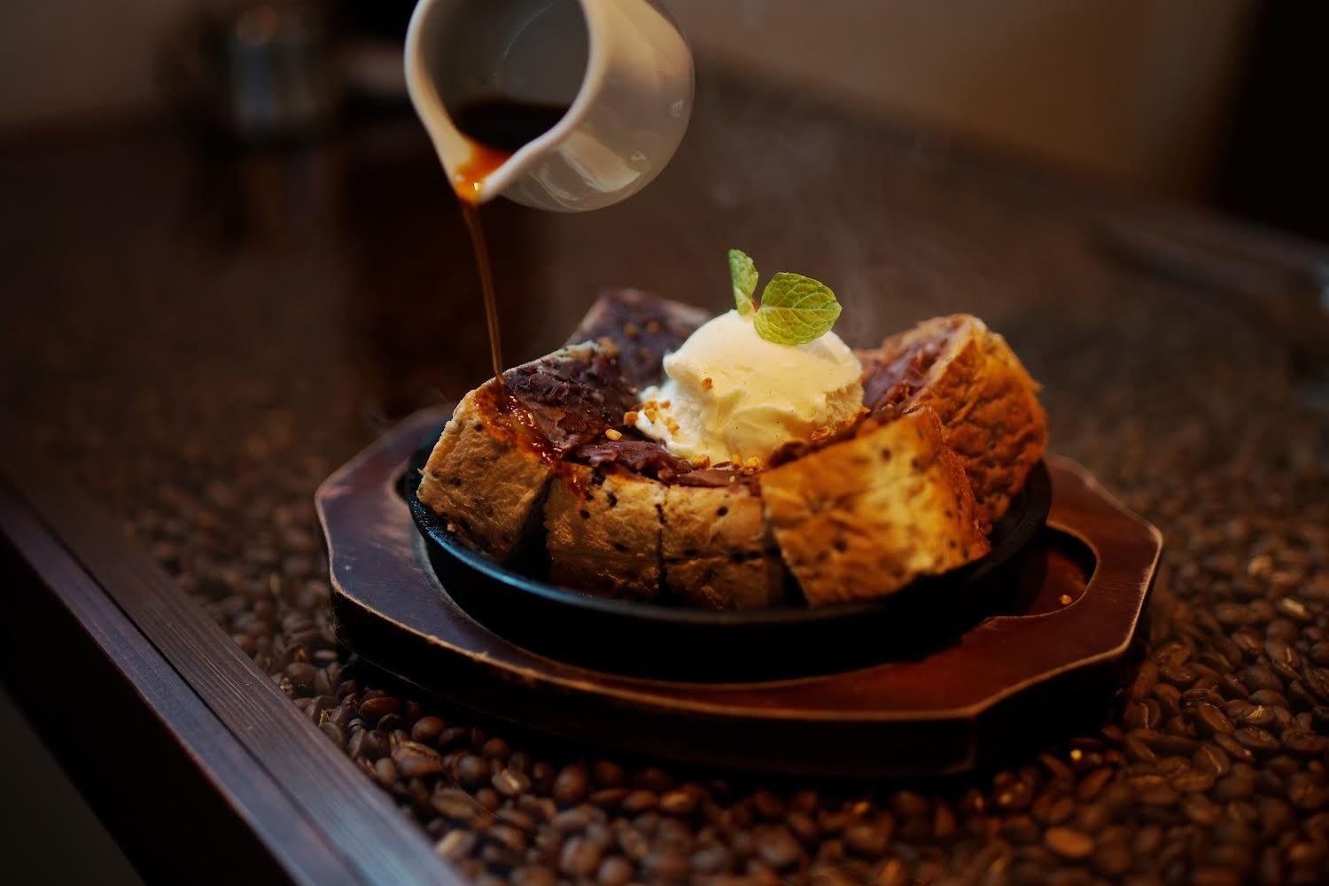 小倉トースト数珠繋ぎ、お次は「喫茶ニューポピー」。熱々の鉄板にバターをひき、こんがりとトーストした黒ごまパンに、手間ひまかけて甘さ控えめに炊かれた自家製小倉あんをたっぷりと。バニラアイスの上から自家製のコーヒーシロップをかけて完成!黒ごまパンの下にできる、バターとコーヒーシロップのおこげも絶品!