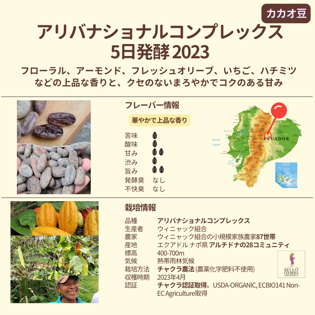 品種:アリバナショナルコンプレックス(ナショナル種(アリバカカオ)を中心にトリニタリオ、クリオロ等のハイブリッド(概ね80%ナショナル、15%トリニタリオ、5%クリオロ)