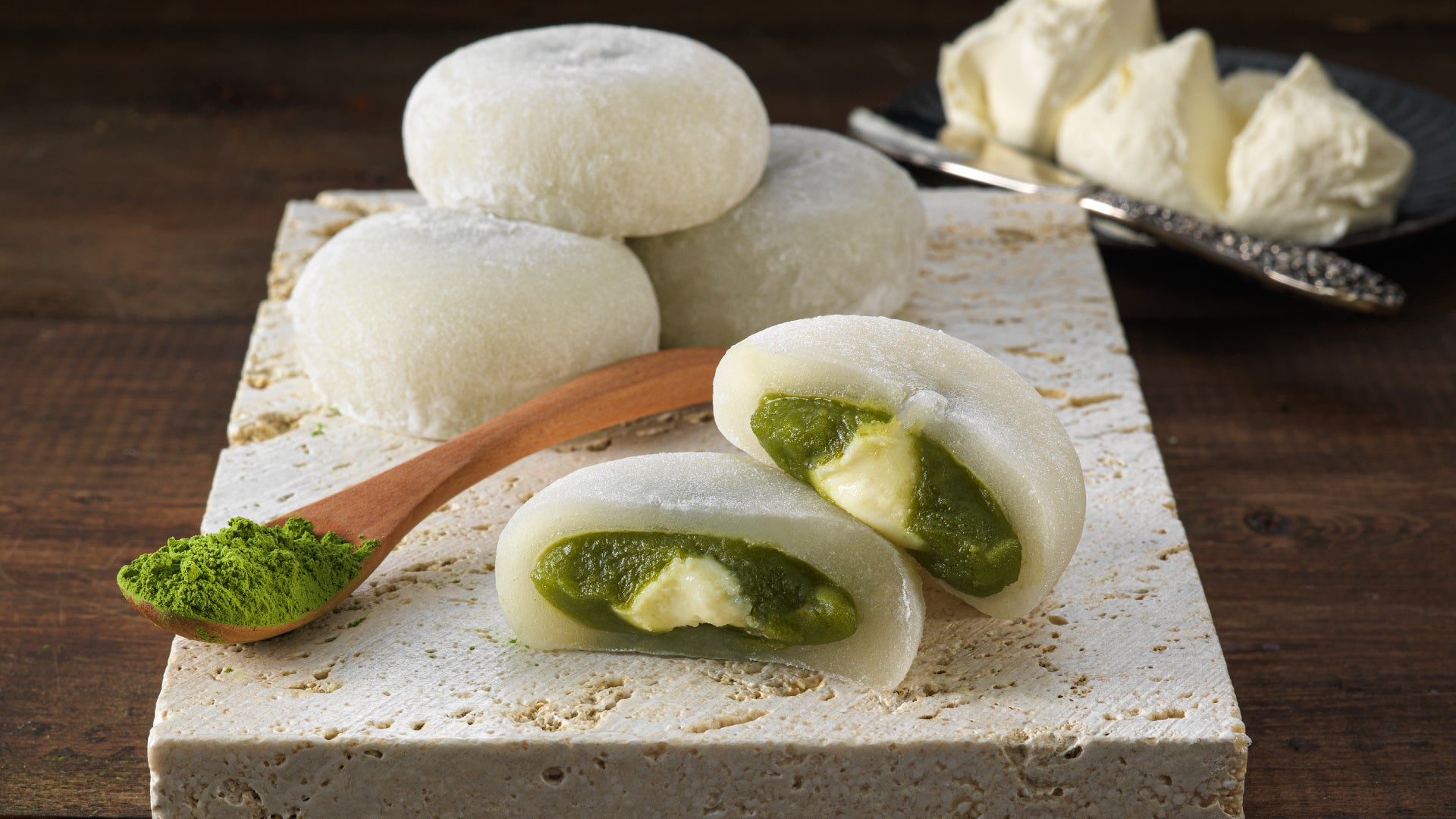 京都の琴引浜の塩を使用したお餅に宇治抹茶餡とマスカルポーネチーズとチェダーチーズ入クリームを包み込みました。もちっとした食感と抹茶のほろ苦さ、そしてクリーミィなチーズの絶妙なあんばいは、まさに和洋折衷。