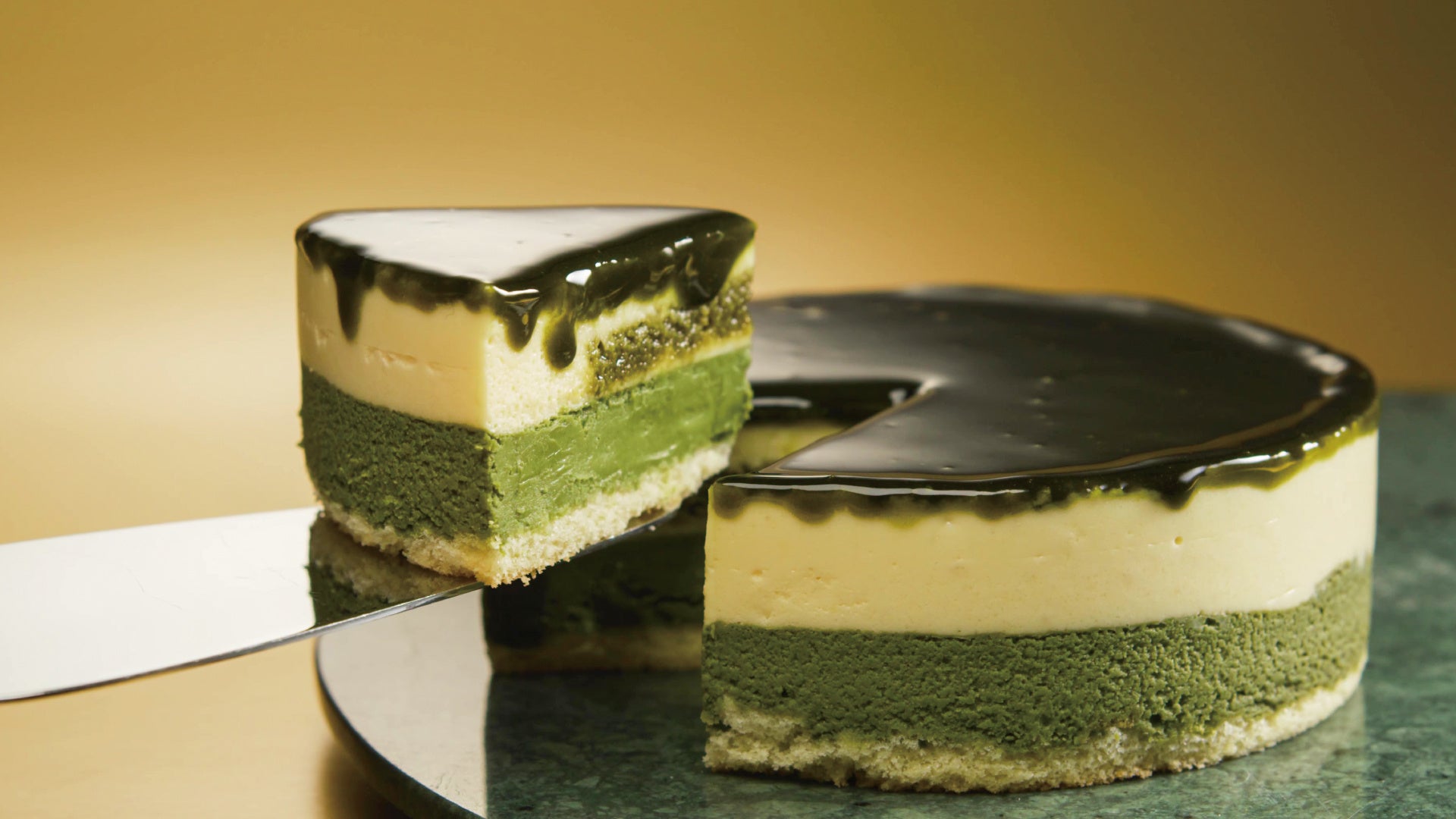 下層は抹茶のベイクドチーズケーキ。上層はレアチーズのムース。表面には抹茶のナパージュをかけ濃い抹茶の苦みを感じるチーズケーキです。