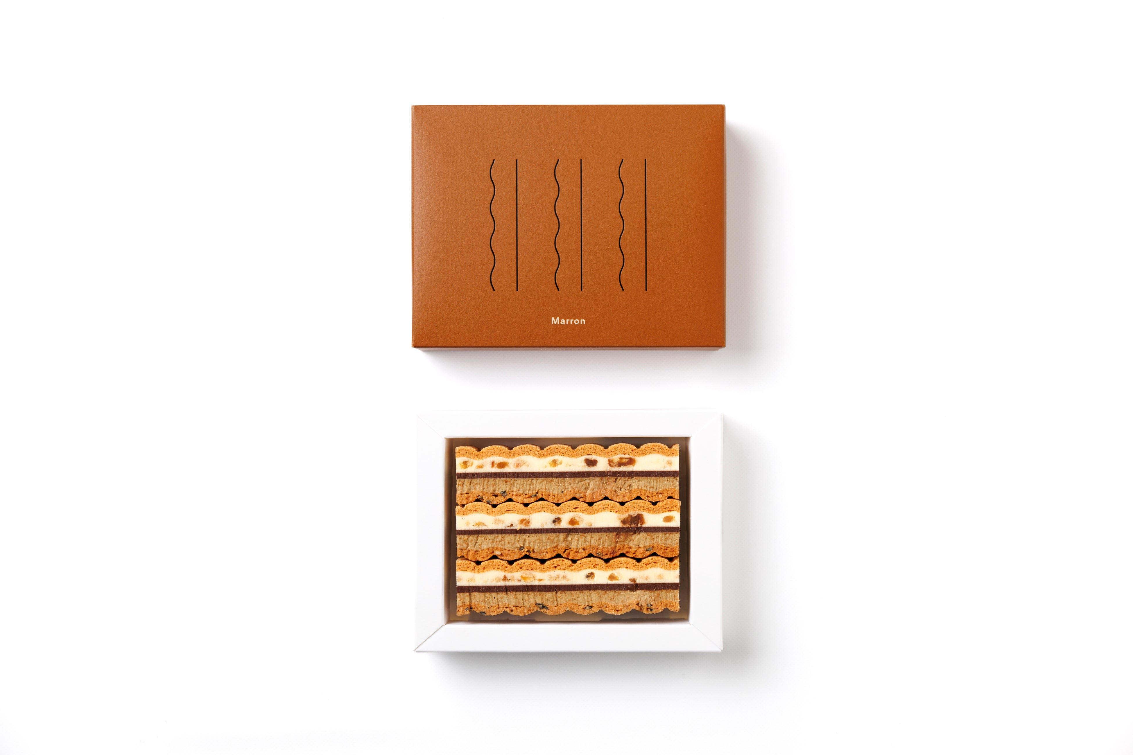 栗の味が凝縮されたイタリア産マロングラッセを散りばめたマロンとバニラのクリームと、ほうじ茶のクリーム、ビーントゥバーチョコレートをバニラサブレとゴマサブレでサンド。栗とバニラの甘い香りとほうじ茶の香ばしさが合わさった、ほっくりとした味わいです。