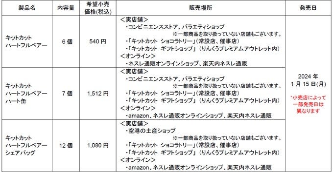 2024年のバレンタインシーズンは、リアルに人と会いながら、チョコレートの祭典としてのイベントを最大限楽しみたいという需要がさらに回復すると想定されています。そこで、バレタイン時期にしか手に入らない特別な「キットカット」を通じて、日頃なかなか伝えることができない感謝の気持ちをカジュアルに伝えたり、気軽なギフトとして友人などとシェアしながら、バレンタインシーズンを楽しんでもらうことを目指して、「キットカット ハートフルベアー」3タイプを1月15日(月)より期間・数量限定で販売開始します。