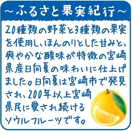 「野菜生活100 宮崎日向夏ミックス」は、ほんのりとした甘みと、爽やかな酸味が特徴の宮崎県産日向夏の味わいに仕上げた野菜・果実100%ミックスジュースです。朝食のおともやリフレッシュしたいときにおすすめです。パッケージには、宮崎県の野生の馬を見ることが出来る観光スポットでもある都井岬と、太平洋をデザインしています。
