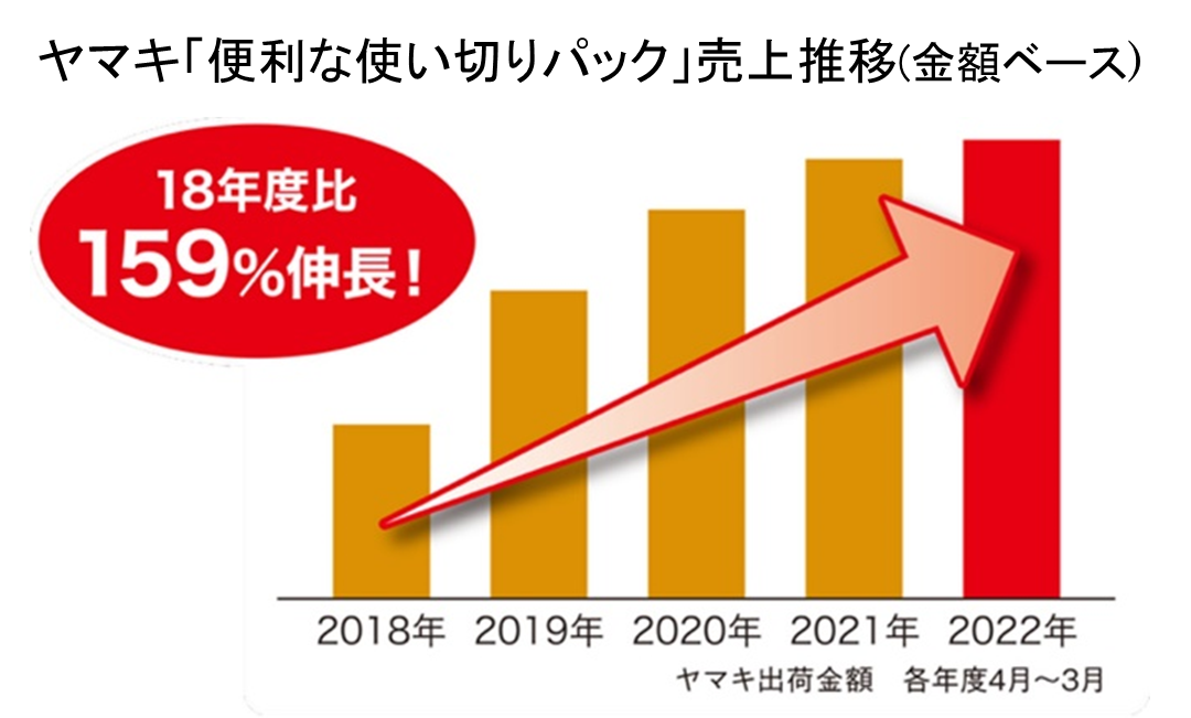単身者世帯や小分け商品需要の増加により、ヤマキの使い切りかつおパックの売り上げは2018年からの5年で約160%伸長しています(※)。